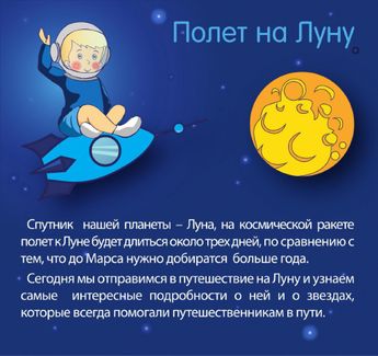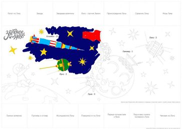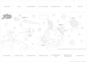 - Карта-раскраска, позволяющая ребенку проявить свое творчество и запомнить новую для него информацию о Луне. На эту карту ребенок может самостоятельно наклеить стикеры с информацией, а также раскрасить изображения карандашами или фломастерами. Благодаря тому, что в процессе творческой работы ребенка задействовано большинство анализаторов (ребенок видит привлекательные иллюстрации, воспринимает на слух информацию, которую читает ему взрослый, включает моторную деятельность, раскрашивая и приклеивая материал), новая для него информация будет легко усваиваться. Однако самое главное, что в процессе такой творческой работы формируется и развивается познавательная активность ребенка, его любознательность, внимание, мышление, память, речь и воображение!