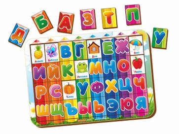 Деревянный планшет предназначен для изучения алфавита в легкой игровой форме. Под каждой буквой малыш найдет изображение предмета, начинающегося на эту букву. Прекрасный обучающий материал, выполненный из натуральной фанеры. None