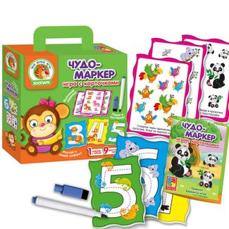 "Чудо-маркер" - увлекательная игра с карточками для малышей, с которой малыш научится писать цифры, разовьет речь и внимание.Особенности: плотные карточки и многоразовый маркер. None