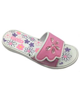 Стильные сланцы Alfox Цветок для девочек. Шлепанцы регулируются по полноте ноги с помощью липучки. Спереди украшены камешками в виде цветка. Легкая и практичная модель для летнего отдыха. Минимальная сумма заказа 1500 руб. Возможен самовывоз. Есть доставка.