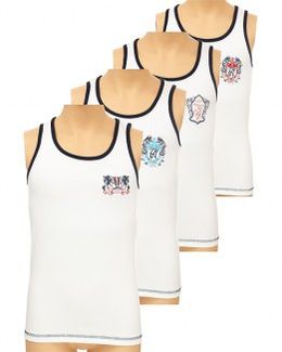 Майка Baykar для мальчика из белого хлопка с принтом герба спереди, отделана чёрным на проймах и по линии горловины. Минимальная сумма заказа 1500 руб. Возможен самовывоз. Есть доставка.