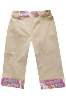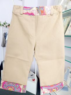 Бежевые брюки с сиреневой отделкой Fleole для девочки. Изготовлены из плотного хлопка, отвороты и пояс брюк декорированы цветной тканью. На талии есть утяжка. Минимальная сумма заказа 1500 руб. Возможен самовывоз. Есть доставка.