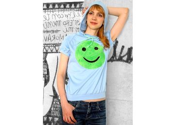 Футболка женская с капюшоном , с манжетами на рукавах и по низу изделия. степень прилегания по фигуре: свободная. смайлик сделан из мягкого материала с высоким ворсом. глазки и ротик сделаны вышивкой. на фото на модели футболка р. 42-44. российские размеры: подростковые - 36-38, 38-40; взрослые - 42-44, 44-46, 46-48 None Есть доставка.