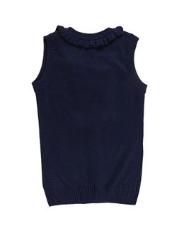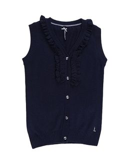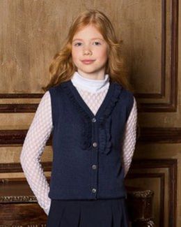 Жилет для девочки синий с пуговицами Luminoso вдоль горловины декорирован рюшей. Изготовлен из качественных материалов на основе шерсти, кашемира и вискозы. Жилет мягкий, удобный и теплый, отлично сочетается с классическими блузками и водолазками. Наличные, Visa/MasterCard, Яндекс.Деньги, WebMoney Возможен самовывоз. Есть доставка.