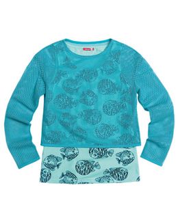 Комбинированный джемпер для девочки с длинным рукавом. Нижняя часть выполнена в форме майки с принтом рыбок. Верхняя часть выполнена в форме накидки из спортивной сетки, которая создаёт эффект многослойности изделия. Минимальная сумма заказа 1500 руб. Возможен самовывоз. Есть доставка.