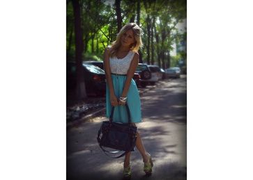 Летнее платье: лиф кружево на трикотаже, юбка из бирюзового шифона, нижняя юбка- молочный шифоннепрозрачный), пояс тоненький коричневый с металлической подвеской. размер 42 None Есть доставка.