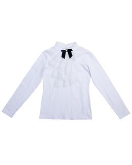 Блузка S Cool Золотые искры - нежная женственная модель, которая подойдет как для праздника, так и для школьных будней. Выполнена из эластичного трикотажа белого цвета. Впереди декорирована гипюром и черным атласным бантиком. Минимальная сумма заказа 1500 руб. Возможен самовывоз. Есть доставка.