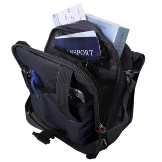 Сумка внутри имеет одно основное отделение на молнии с внутренним карманом и карманом-органайзером на молнии (включает 4 отделения для карточек, 2 кармана для мелких предметов, 3 держателя для ручек, сетчатый карман на молнии, карман на молнии и карабин для ключей). На внешней лицевой стороне расположен карман на молнии, карман на молнии с отверстием для наушников, задний карман, ручка для переноски, плечевой ремень с мягким подплечником, регулируемый по длине Особенности: