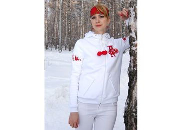 Толстовка белого цвета на молнии, с капюшоном и карманами. прямой крой, степень прилегания по фигуре - плотная. по всей длине изделия застежка-молния манжеты на рукавах и по низу изделия. капюшон со стоечкой. карманы прорезные на молниях. ткань для пошива – футер высокой плотности с начёсом. вещь очень тёплая, комфортная, мягкая и уютная. толстовка необычайно нарядная. она украшена пушистыми красными помпошками на шнурке. на груди и на рукавах бархатный объёмный рисунок в стиле старорусской вышивки. на фото на модели толстовка р. 44-46. российский размер: 42-44,44-46,46-48,48-50,50-52 None Есть доставка.
