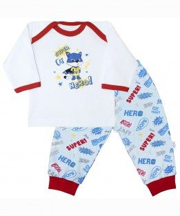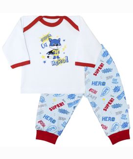 Пижама Супергерой Веселый малыш - комплект для сна из трикотажного полотна высокого качества. Футболка с удобным для одевания вырезом горловины и длинным рукавом, штанишки с поясом на резинке. Низ штанин на манжетах. Вырез горловины и низ рукавов декорированы окантовкой красного цвета. Декор в виде надписей, впереди на футболке - изображение кота-супергероя. Минимальная сумма заказа 1500 руб. Возможен самовывоз. Есть доставка.
