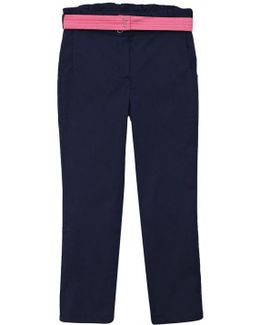 Брюки Ёмаё с ремешком синие имеют спереди два прорезных кармана и застежку на молнии с пуговицей. Верх изделия украшает небольшой рюш по линии талии. Поставляются брюки вместе с тканевым ремешком на резинке, который застегивается на кнопки. Сшита модель из хлопковой ткани с лайкрой. Минимальная сумма заказа 1500 руб. Возможен самовывоз. Есть доставка.