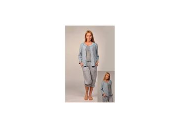 Комплект женский ТМ-701 Комплект женский для дома - тройка, сшит из уютного, мягкого трикотажа интерлок. Комплект состоит из 3-х предметов: штанишки - капри с оборкой, топик и кофта с застежками. Капри свободного покроя с накладными карманами. Кофта - топ с рисунком и кофта с длинными рукавами свободного покроя на пуговках. Костюм подойдет для будущих мам с небольшим сроком беременности и для молодых мамочек.