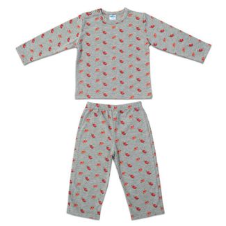 Пижама для девочки из легкого 100% хлопка серого цвета, который расцвечен красным принтом “Птички”. Пижама имеет прямой крой, поэтому ребенку в ней будет комфортно. На поясе штанов – нетугая резинка. Кофта застегивается на две кнопки на правом плече. Пижама отлично переносит стирку, не теряет форму. None
