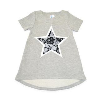 Чудесное серое платье для девочки выполнено из хлопковой ткани - футера. Стильное платье свободного кроя с удлиненной спинкой. None