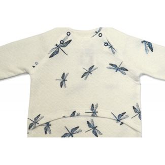 Плотная толстовка кремого цвета на фактурной ткани (геометрический оттиск). Украшена синим принтом “Стрекозы”. Застегивается на кнопки (по две слева и справа на ключицах). Состав ткани (80% хлопка и 20% полиэстера) гарантирует вещи долгую жизнь. Толстовка подходит девочкам от четырех до семи лет. None