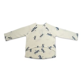 Плотная толстовка кремого цвета на фактурной ткани (геометрический оттиск). Украшена синим принтом “Стрекозы”. Застегивается на кнопки (по две слева и справа на ключицах). Состав ткани (80% хлопка и 20% полиэстера) гарантирует вещи долгую жизнь. Толстовка подходит девочкам от четырех до семи лет. None