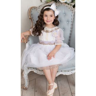 Платье из мягкой сетки и кружева на хлопковой подложке с кружевной отделкой на лифе, брошью - цветком и полоской - бантом на голову.Внимание! Фактический цвет изделия может незначительно отличаться от цвета на фотографии в связи с особенностями цветопередачи различных цифровых устройств. None
