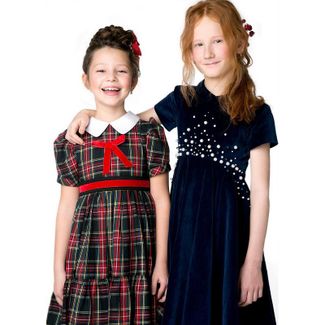 Нарядное платье из хлопкового бархата с слегка завышенной талией,отложным воротничком, маленьким аккуратным рукавом. Лиф расшит жемчужными бусинами.Внимание! Фактический цвет изделия может незначительно отличаться от цвета на фотографии в связи с особенностями цветопередачи различных цифровых устройств. None