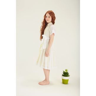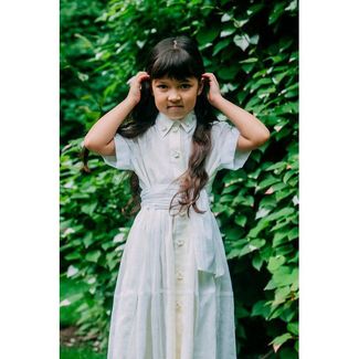 Нарядное, подходящее для повседневной носки платье рубашка из белого прозрачного батиста на тонкой хлопковой подложке желтого цвета, застегивается на рабочую планку, декорировано цветами из пайеток. Верх имитирует рубашку. Объем по талии регулируется широким поясом - бантом. Очень нежное и элегантное платье сделает любую девочку похожей на настоящую леди. None