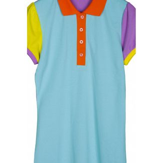 Модное платье-поло. «Фишка» модели – контрастное сочетание 4 оттенков: голубого, сиреневого, оранжевого и цвета лайм. None