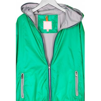 Ультрамодная ветровка для мальчика бирюзового цвета с контрастными серыми молниями. Подкладка выполнена из трикотажного полотна. По низу модели сделана утяжка. Удлиненная молния идет и по капюшону. None