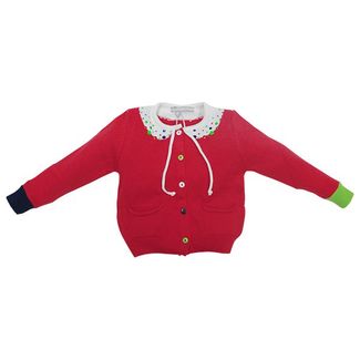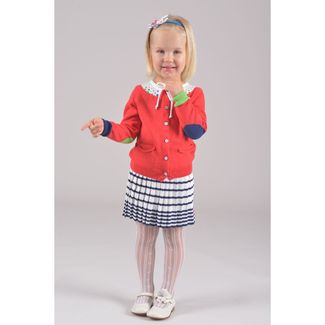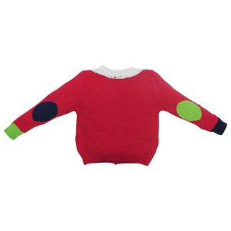 Восхитительный жакет для маленькой модницы из мягкой хлопковой пряжи. Модельная особенность - имитация отложного воротничка контрастного цвета, украшенного термоаппликацией из разноцветных веселых фигурок. Жакет на пуговицах с круглым вырезом горловины и декоративными завязками. Модель декорирована цельновывязаными карманами, яркими контрастными налокотниками и разноцветными резинками по низу рукавов. Такой изящный жакет добавит образу маленькой модницы индивидуальность и подчеркнет уникальный эстетический вкус. None Можно купить без предварительного заказа.