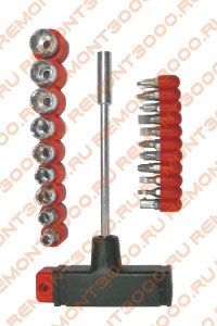 Т-образная пластмассовая ручка с отделением для хранения бит. Торцевые головки: 5, 6, 7, 8, 9, 10, 11, 12, 13 мм. Биты: плоский шлиц 3, 4, 5, 6 мм; крестовой шлиц #1; #2; #3; крестовой шлиц пози #1; #2; #3. Адаптер. Наличные, банковская карта, безнал (с НДС)