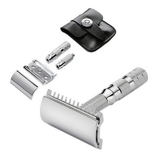 Самая маленькая разборная Т-образная бритва с открытым срезом в чехле из натуральной воловьей кожи. Материал станка - хромированная сталь. Ручка станка состоит их двух элементов; в разобранном виде верхняя часть рукояти помещается в нижнюю для экономии пространства. Рукоять имеет тактильно очень приятный рисунок, позволяющий уверенно держать бритву даже мокрыми мыльными руками. Головка традиционная, состоит их двух деталей: верхней пластины и гарды. Крепится голова к рукояти при помощи винтового соединения. Голова "гребенкой" позволяет добиться чистого и гладкого результата. Дорожный набор Merkur 90985000 - это хороший помощник в пути, ведь размер комплекта легко умещается в ладони. Комплектация: