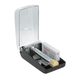Для мужчин, часто отлучающихся в деловые командировки, когда каждое утро надо выглядеть как "огурчик", настоящим спасением станет дорожный бритвенный набор, состоящий из пластикового кейса, т-образного станка Merkur Progress и пачки сменных лезвий Merkur Super Platinum. Кейс весьма легок, станок и пачка лезвий внутри него жестко фиксируются, плюс имеется еще одно место под дополнительную упаковку с лезвиями. Станок выполнен из высококачественной хромированной стали. Восьмигранная ручка станка гармонично сочетает в себе хромированную поверхность и кремовую регулировочную ручку. Станок, выполненный из тяжелого твердого металла, приятно держать в руке, процесс бритья превращается в мужской ритуал. Длина рукояти составляет 88 мм. Т-образный станок для бритья Merkur 90570001 (570C) с регулируемым углом ноклона лезвия имеет 5 различных положений для различных уровей мастерства и обеспечивает эффективное комфортное бритье. Такой станок идеально подойдет как для новичков, так и для профессионалов. Станок идет в комплекте с упаковкой лезвий (10шт.) в прочном пластиковом чехле. Технические характеристики: