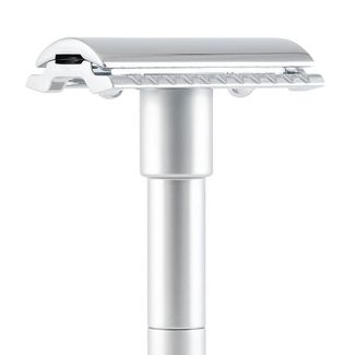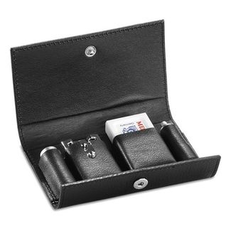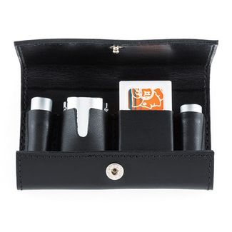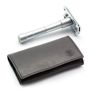 Один из самых компактных дорожных наборов состоит из бритвы Merkur 46С и чехла из натуральной кожи. Разборный Т-образный станок для бритья Merkur 9046002 имеет закрытый гребень, что обеспечивает более безопасное мягкое бритье. Рукоять бритвы состоит из двух элементов и выполнена из сатинированной стали, ее длина - 75 мм. Голова с закрытым срезом изготовлена из хромированной стали, ее длина составляет стандартные 41 мм. Главным качеством станка является эргономичность, при этом бритва довольно увесистая для походного варианта (45 г) и с длинной ручкой: в собранном виде общая длина изделия составляет 85 мм. Станок довольно мягко работает, поэтому если вам нужно что-то поагрессивнее, рекомендуем поиграть со сменными лезвиями, ведь, как известно, разные лезвия ведут себя в паре со станком по-разному. Размер чехла 100 х 60 мм, т.е. он совсем небольшой и при желании его можно просто убрать в карман. Внутри четыре отделения: два для разборной ручки и по одному для головы и упаковки лезвий; закрывается на кнопу. В комплект также входит упаковка сменных лезвий Merkur Super Platinum. Технические характеристики: