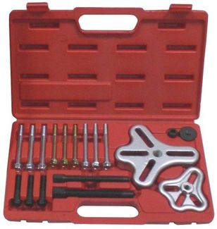 KA-1018 Приспособление для снятия шкивов, Универсальный набор предназначен для снятия набор 18 предметов. шкивов, рулевых колес, зубчатых колес и т.д. Большой ассортимент различных насадок делает комплект совместимым с большинством автомобильной и мототехники. Комплект: Адаптер бабочка большой - 1 Адаптер бабочка малый - 1 Упорный резьбовой вал ?15.5mm x L 140mm Упорный резьбовой вал ?10.9mm x L 125mm Винт 5/16” x 24 x 3” - 2 шт. Винт 3/8” x 16NC x 3” - 2шт. Винт 5/16” x 18NC x 3-1/2” - 2 шт. Винт 3/8” x 24NF x 3” - 3 шт. Винт 3/8” x 16NC x 3” - 3 шт.