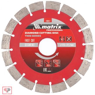 - Matrix Диск алмазный, отрезной сегментный, 115 х 22,2 мм, тонкий, сухая резка Matrix Professional по выгодной цене 258 р. руб.;
