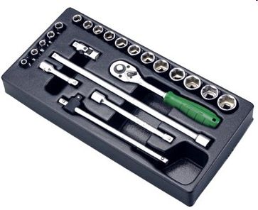 TT-15 Ложемент 3/8" с набором головок и аксессуары 3120GQ Трещотка с быстрым сбросом 3/8” 3800-3/-6/-12 Удлинители 75 мм/150 мм/300 мм 3/8” 3200 Шарнир карданный 3/8” 3770-8 Т-образный вороток 3/8” 3400М Головка торцевая шестигранная 3/8”: 6, 7, 8, 9, 10, 11, 12, 13, 14, 15, 16, 17, 18, 19, 20, 21, 22 мм