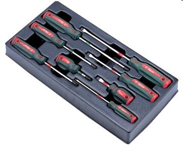 TT-10 Набор отверток Hans в ложементе: 0410М Отвертки шлицевые: 4 (100 мм), 5.5 (125 мм), 6.5 (150 мм), 6.5 (38 мм) 0420РН Отвертки PHILIPS: PH1 (100 мм), РН2 (150 мм), РН2 (38 мм) 0430PZ Отвертка POZIDRIV PZ1 (100 мм)