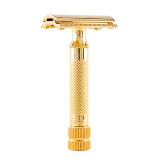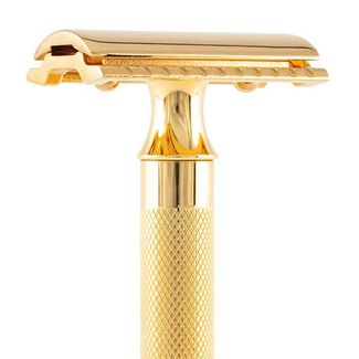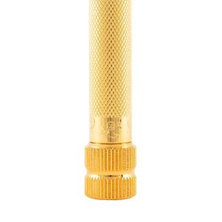 Необычный Т-образный станок для бритья Merkur 34G выделяется своим превосходным золотым цветом. Хороший баланс станка Merkur 34G (вес изделия 80 г) позволяет держать его за самый кончик, избегая какого-либо давления на бритвенную голову во время процесса. Даже в больших ладонях такой размер не будет проблемой, и вы сохраните полный контроль над станком. Толщина рукоятки - 12 мм, в то время как диаметр нижнего набалдашника - 15 мм. Классическая голова с закрытым срезом Closed comb гарантирует мягкое бритье. Поэтому данный инструмент особенно хорошо подойдет молодым людям, щетина которых не отличается жесткостью, а эпидермис требует бережного отношения. Конструкция у Т-образной бритвы Merkur 34G двухсоставная: ручка с нижней плитой и верхняя прижимная планка отдельно. Чтобы заменить сменное лезвие необходимо открутить нижнюю торцевую головку рукояти. Технически, станок разбирается даже не на два, а на три элемента, поскольку, от ручки при желании можно отделить ее нижнюю часть. Технические характеристики: