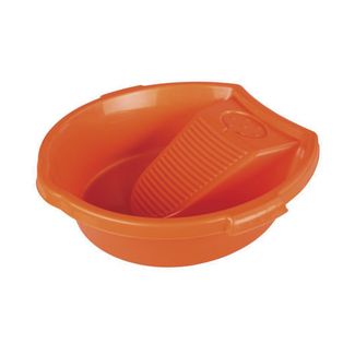 Конструкция таза имеет горку с ребристой поверхностью и место для мыла. Также таз оснащен ручками для более удобной переноски. Таз имеет легкий вес.