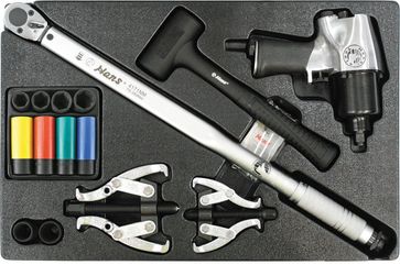 TT-49 Ударные головки и аксессуары Hans в ложементе: • 4171Nm Ключ динамометрический 70-350Nm • 84304P Головка ударная тонкостенная: 17,19,21 мм • 84304M22 Головка ударная:22 мм • 84404M Супер тонкостенная головка ударная 17,19,21,22 мм • 5700P-24 Молоток • 5322-3/-4 Съемник двухлапый: 75 мм, 100 мм. • 84110 Пневматический гайковерт 542Nm 1/2” • Головка для контргаек 1”, 13/16