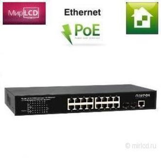 Коммутатор Ethernet PoE. 18-портовый, гигабитный, управляемый коммутатор Ethernet c питанием через PoE стандартную витую пару (или стандартную сеть переменного тока AC). 16 портов с поддержкой PoE, 2 порта SFP. Цвет: Черный. Производитель: Нидерланды. None