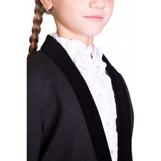 Стильный жакет для девочки из костюмного трикотажа. Модель декорирована воротником-шалью из бархата, накладными карманами с отделкой из бархата и кружева. Рукав жакета регулируется по длине на 6 см. Приталенный силуэт и контрастная подкладка делают модель стильной и запоминающейся. Отлично сочетается с брюками и юбкой из линии. None