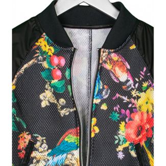 Красивая черная куртка для девочки, в которой сочетаются разные по фактуре материалы. Рукава выполнены из плащевой ткани, вставка с цветочным принтом из неопрена. Манжеты и ворот куртки из вязаного трикотажа. None