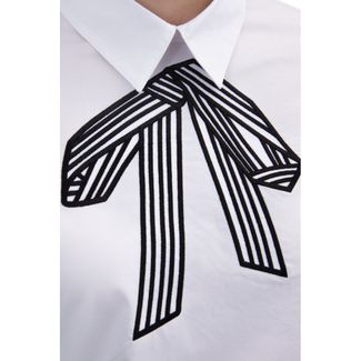 Стильная блузка из хлопка с удлиненной спинкой. Отсутствие пуговиц и контрастная вышивка в виде галстука-банта – главные фишки модели. Блузка идеально сочетается с брюками или юбкой. None