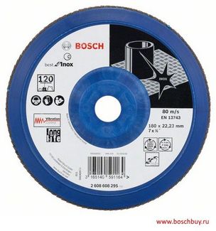 - Bosch Лепестковый шлифкруг X581 Best for Inox 180 мм P120 по нержавейке (2608608295 , 2.608.608.295) по выгодной цене 379 р. руб.;