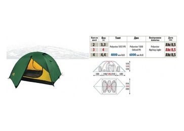Классическая палатка с двумя входами и двумя тамбурами для вещей. Технические характеристики: Кол-во человек: 4 Ткань тента: Полиэстер PU 185 6000 mm H20 Ткань палатки: полиэстер Oxford PU 150 D Ткань дна: Полиэстер PU 185 6000 mm H20 Дуги: Alu 8,5 Вес: 4,4 кг None Есть доставка.