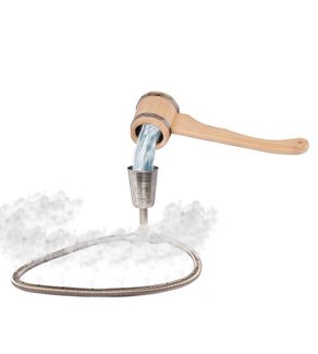 Парогенератор в печах с закрытой каменкой нужен для получения максимально полезного мелкодисперсного пара.Парогенератор состоит из лейки и системы трубок, с помощью которой вода попадает с середину каменки. Сильно нагретые камни моментально испаряют воду со взрывным эффектом. При этом камни в каменке не успевают сколь-нибудь значительно остыть. Каменка с парогенератором всегда готова к работе и всегда выдаёт водяную взвесь самой мелкой фракции.Трубка парогенератора сделана в виде гибкого кольца, чтобы количество воды, подаваемой в разные стороны каменки, было одинаковым и камни слева и справа от парогенератора имели одинаковую температуру.Гибкая часть парогенератора укладывается в каменку среди камней.Вода в виде капель попадает на камни через отверстия, сделанные в трубке устройства. Небольшие капли воды испаряются практически моментально, за доли секунды превращаясь в пар. None