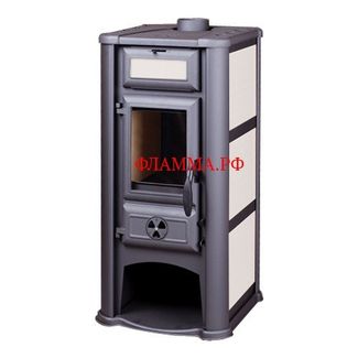 ЛИДЕРАТА с керамическими вставками. Современная стильная печь-камин Lederata предназначается для обогрева помещений площадью до 90 м . Быстрому и эффективному распространению тепла способствует заложенный в конструкцию конвекционный принцип теплоотдачи. Корпус печи изготавливается из тонколистовой стали и покрыт термостойкой краской. Корпус несёт функцию каркаса и имеет малый вес. Топка имеет кладку из огнеупорного шамотного кирпича способного выдерживать термические нагрузки до 1400°С. Задняя стенка топки чугунная имеет специальные технические отверстия для подачи воздуха в камеру сгорания. Эта система обеспечивает вторичный дожиг уходящих газов, тем самым способствует увеличению КПД и длительности горения закладки дров, тем самым экономии топлива. Дверца топочной камеры изготовлена из серого чугуна и застеклена стеклокерамикой, способной выдерживать температуру до 750°С. В местах соприкосновения с корпусом и стеклом использован уплотнительный шнур. Дверца закрывается герметично, благодаря массивной ручке с прижимным замком. Над дверцей топки имеется регулировка подачи воздуха на стекло. Система позволяет стеклу оставаться чистым. Колосниковая решётка выполнена из чугуна и имеет подвижный механизм для стряхивания золы. Зольный ящик спрятан за чугунной дверцей с регулировкой подачи воздуха на колосник. Чистку от золы можно производить не прерывая горения. Подключение к дымоходу производится через чугунный патрубок, расположенный сверху. Внешне печь облагорожена вставками различных цветов из керамики.