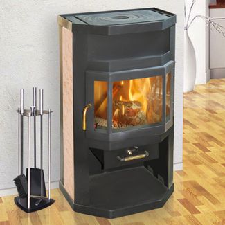 - Печь оснащена чугунной варочной плитой и декоративными керамическими вставками.