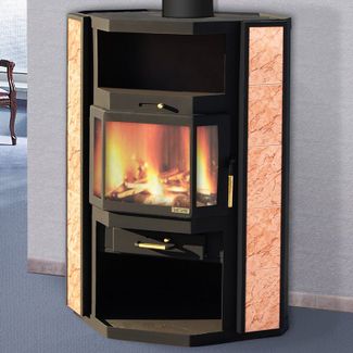 - Пристенно-угловая модель с универсальным подключением дымохода (заднее и верхнее). None