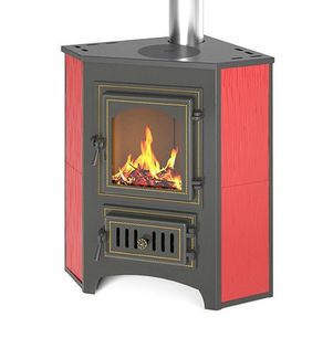 Печь-Камин ВЕЗУВИЙ ПК-01 (220) угловой красн. с конфоркой 9 кВт (150 м3) Ø 115мм