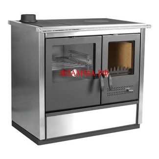 North новая кухонная плита для загородного дома. Очень красивая кухонная печь работающая на дровах предназначенная для приготовления различных блюд на плите или в духовке. Чудный аромат приготовленных рецептов на плите Норд не оставит равнодушным ни одного гурмана. Корпус печи изготавливается из шлифованной нержавеющей стали. Корпус несёт функцию каркаса и имеет малый вес. Топка выложена вермикулитовыми плитами способными выдерживать термические нагрузки до 1200°С. Вермикулитовая плита является защитным материалом корпуса печи. Духовой шкаф оснащён термометром и решёткой. Дверца топочной камеры застеклена стеклокерамикой, способной выдерживать температуру до 750°С. В местах соприкосновения с корпусом и стеклом использован уплотнительный шнур. Дверца закрывается герметично, благодаря массивной ручке с прижимным замком. Над дверцей топки имеется регулировка подачи воздуха на стекло. Система позволяет стеклу оставаться чистым. Колосниковая решётка выполнена из чугуна и имеет подвижный механизм для стряхивания золы. Зольный ящик спрятан за чугунной дверцей с регулировкой подачи воздуха на колосник. Чистку от золы можно производить не прерывая горения. В нижней части печи имеется вместительный ящик для хранения дров. Подключение к дымоходу производится через чугунный патрубок, расположенный сверху или сзади с правой или левой стороны от топки.