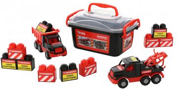 - 215-01 MAMMOET, автомобиль-самосвал + автомобиль-эвакуатор + конструктор (10 элементов) (в контейнере) в каталоге Пластиковые игрушки в России;
